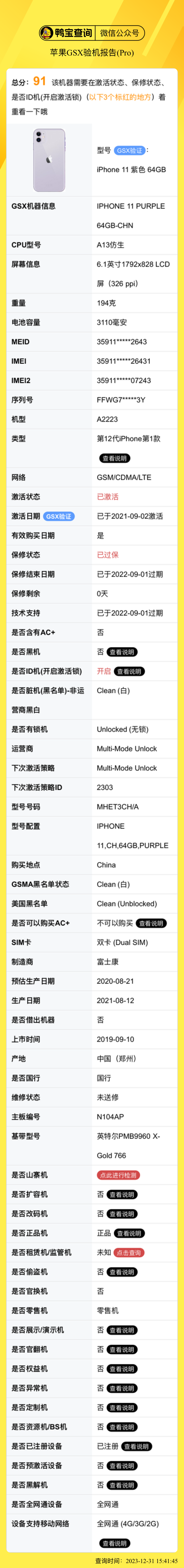 鸭宝查询的GSX验机对比官网有什么优势呢?首先GSX验机的数据也是官方的,GSX验机是苹果公司提供的一项服务,主要用于验证苹果设备的真伪和维修保修情况。通过GSX验机,用户可以查询设备的序列号、型号、生产日期、保修状态等信息,也能鉴定手机是否扩容机、官翻机、演示机,也能确认手机是否为有锁机(卡贴机)。