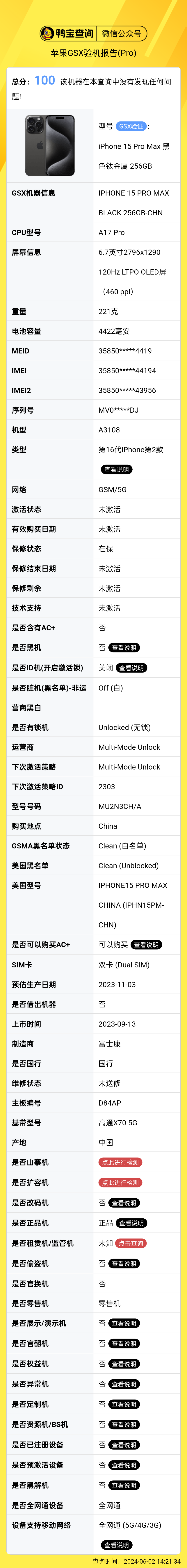 打开【鸭宝查询】选择【GSX验机报告Pro】输入iPhone的SN序列号或者imei号查询手机原厂信息,快速分辨iPhone是否资源机,也可以快速鉴定是否扩容、黑机、ID机、监管机,黑解机等小白容易买到的机器。