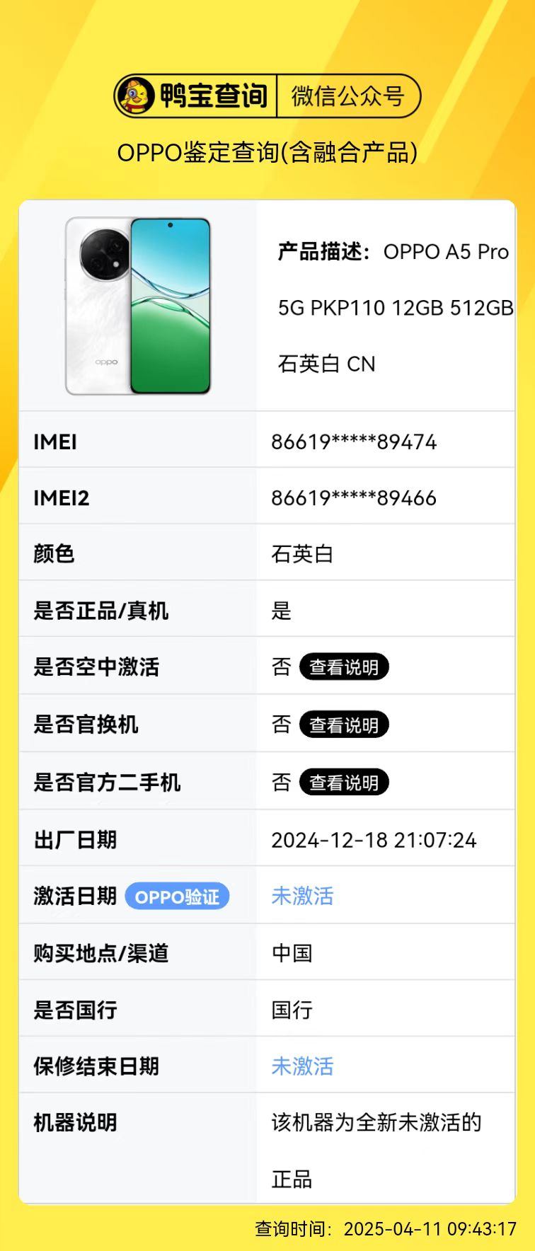 拿到手机的第一时间,先别急着开机。仔细检查包装盒的封口是否完整,原厂封条是否有被破坏的痕迹。打开包装后,首先核对包装盒、保修卡和手机本身三处的IMEI码是否一致(拨号*#06#可查询)。配件方面,确保充电器、数据线、取卡针等配件齐全且崭新无使用痕迹。将手机放在光线充足的地方,仔细检查机身各个角落。重点查看屏幕边缘、摄像头周围、充电接口等容易受损的部位。原装机的接缝处应该严丝合缝,按键反馈清脆有力。特别要注意屏幕是否有划痕、气泡,以及机身是否有不正常的磨损或掉漆。开机后,先测试屏幕显示效果。可以打开纯色背景图,检查是否有坏点、漏光等问题。触控测试也很重要,可以在画图应用中尝试多指触控,确保屏幕每个区域都能准确响应。接着测试通话质量、WiFi连接稳定性、前后摄像头成像效果等基础功能。最后别忘了输入*#899#进入工程模式,对各项传感器进行快速检测。完成上述检查后,建议使用"鸭宝查询",它能提供更详细的查询服务。如果发现任何异常,建议立即联系卖家或前往OPPO官方售后点进行进一步检测。记住,验机不是走流程,而是对自己权益的负责。花10分钟认真检查,可能就能避免日后数月的烦恼。如果对自己的判断不够自信,不妨花点小钱去官方售后做个专业检测,买个安心也值得。