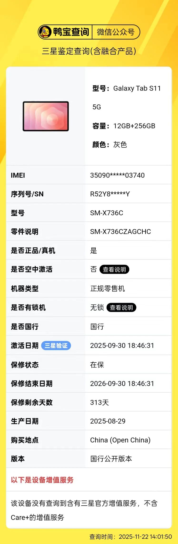 包装盒:正品盒面印刷清晰无模糊,塑封膜平整无破损起皱,封条无二次粘贴;盒身需标注 “Galaxy Tab S11” 及准确型号(如 SM-X730NZALCHN),IMEI 码、SN 码与鸭宝查询结果一致。